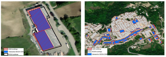 (Left) A visual example of the comparison of building data derived from the National Geo-Portal (GPN_12_ED) and the OSM database (OSM_12) in a strictly urban location of Rome, Central Italy (red and black indicate the building polygons identified through OSM and BODA, respectively); the full coverage of OSM with respect to the BODA archive is documented here. (Right) Spatial overlap of the content of OSM and BODA archives: an example from Frosolone, a rural municipality in Molise, Southern Italy; the partial coverage of OSM with respect to BODA is documented here.