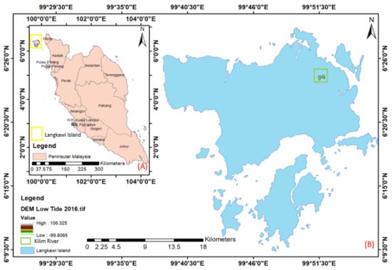 The Kilim River in Langkawi Island, Kedah, Malaysia, has been chosen as the study site (Figure 1). This study area was designated as a UNESCO Kilim Karst Geoforest Park (KKGP) in 2007. The Kilim River has a semi-diurnal tide because it is located at 6°21.518′–6°26.093′ N and 99°51.159′–99°51.159′ E [4]. Although the Kilim River is approximately three kilometres from the coastal area, the tidal effect still exists and affects the Kilim River. This area has been granted Geopark status by the United Nations Educational, Scientific, and Cultural Organization (UNESCO) because of its impressive rock formations (limestone or karst), the richness of mangrove forests, and its unique geological significance. The study area displays natural mountain valley topography with an average slope of 30°, and some areas are up to 80°, making it quite challenging for a drone pilot to fly over the entire region. The study area is also surrounded by various geomorphological structures such as muddy soil at the riverbank, dense mangrove forest, limestone, karst, and different kinds of rock formations in hilly areas. This region was chosen as the study area because it involves additional land cover, including high-density vegetation, low vegetation, shrubs, and different geomorphological features. The Kilim River was selected due to the previous study by [3], which discovered significant mangrove dynamic changes in this area.