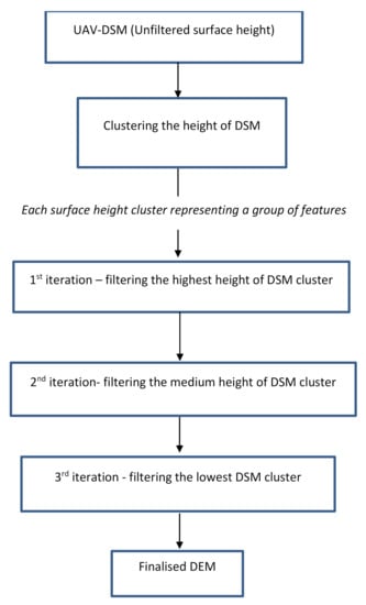For decades, researchers have developed many filtering methods to remove above-ground objects such as vegetation, buildings, and other human-made structures. Filtering approaches such as LAStools triangulated irregular networks (TIN) densification, the typical method in Agisoft Photoscan, and others have been used to filter point clouds by utilising an airborne laser scanner or light detection and ranging (LiDAR) [44,45,46]. Similar to UAV imagery data, it uses several algorithms, for instance, a progressive morphological filter (PMF), a simple morphological filter (SMRF), or a cloth simulation filter (CSF), and a structural filter, Caractérisation de Nuages de Points (CANUPO), for vegetation filtering purposes [47]. Unlike LiDAR, a UAV photogrammetric survey could not penetrate partly through the vegetation layer and, therefore, might have failed to generate actual ground points below a vegetated surface. The aerial photograph could not capture the information below dense vegetation using a typical sensor (e.g., a Red, Green, and Blue (RGB) sensor) unless the captured RGB images are analysed using a specific method, like an excessive greenness vegetation index (ExG-VI), for surface extraction in dense forest areas [45].