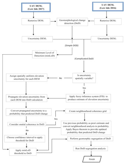 The process starts with selecting the filtered DEM as the input for the DEM survey, and both data are loaded into the GCD software. At least two DEM datasets were required as input, with both datasets being either new or old DEM based on the epoch: New DEM (low tide DEM of 2017) and old DEM (low tide DEM of 2016). The intersection of new and old surface data extents functioned as the area of interest during the change detection analysis of both datasets. The algorithm then selects one of three approaches for evaluating uncertainty: (i) Superficial minimum level of detection (minLoD), (ii) propagated errors, and (iii) probabilistic thresholding. Although this is identical to using the raster calculator in ArcGIS, the GCD software helps apply a threshold to the data. This threshold is helpful since the most commonly used method for managing DEM uncertainties specifies a minimum detection threshold (minLoD) to identify actual surface changes from inherent noise. In this study, minLoD was chosen over propagated errors and probabilistic thresholding because of the simple DEM input using the same threshold, which results in similar errors in the DEM surface. The value for the MinLoD threshold for all ROIs is 0.1 m, according to the value of RMSE for UAV-DSM versus the static GNSS accuracy assessment. Figure 4 displays the flow of the method for generating DEM change detection using GCD stand-alone software.
