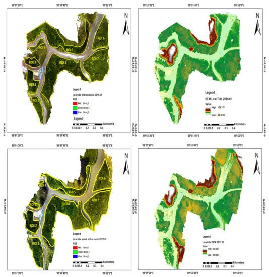 (Top image: Orthophoto and DSM results at low tide in 2016; Bottom image: Orthophoto and DSM results at low tide in 2017); (Red highlights ROI: Eight different regions as the primary focus of this study).