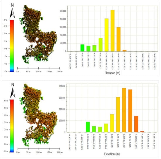 Comparison of the UAV-derived elevation model based on average elevation height distribution in histogram and elevation legend at ROI 2 during 2016 (upper figure) and after (lower figure).