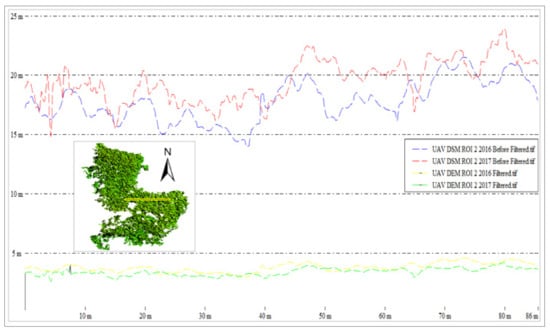 The filtering process was comprised of UAV DSM data in 2016 and 2017. For the epoch of 2016, eight regions of interest (ROI) were established in the study area. In ROI 1, the average height before filtering was between 1.5 m and 25 m, and after the filtering process, the average height was reduced to an average of between −3.7 m and 6.3 m. As shown in Figure 6, the average height before filtering was between −5 m and 29 m, and after the filtering process, the average height was reduced to an average of −1.0 m and 6.0 m. For ROI 3, the average height before filtering was between −10 m and 67 m but decreased to −1.0 m and 5.6 m after the filtering process. Meanwhile, in ROI 4, the average height changed from an average of −37 m to 48 m before filtering into −5.0 m and 6.7 m after filtering. Before filtering, the average height in ROI 5 was between −74 m and 50 m, but it was reduced to between −24 m and 15 m after filtering. In ROI 6, the height changes from an average of −10 m to 30 m (before filtering) into −4.1 m and 12.5 m (after filtering). The following ROI (ROI 7) decreases in average height from −10 and 50 m to −2.5 m and 12.5 m after the filtering process. The last ROI (ROI 8) showed a decreasing average height from −10 m and 35 m (before filtering) to −2.5 m and 10.0 m (after filtering).