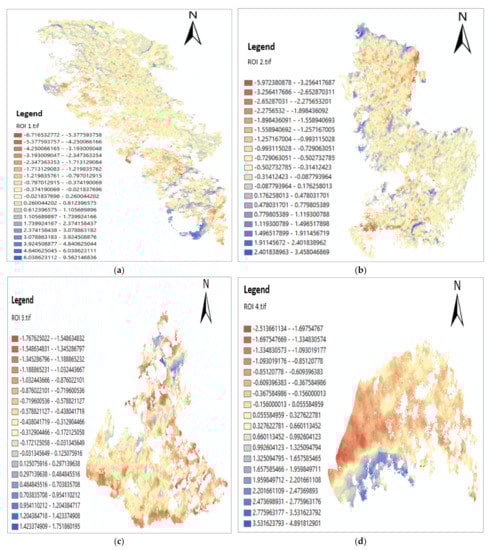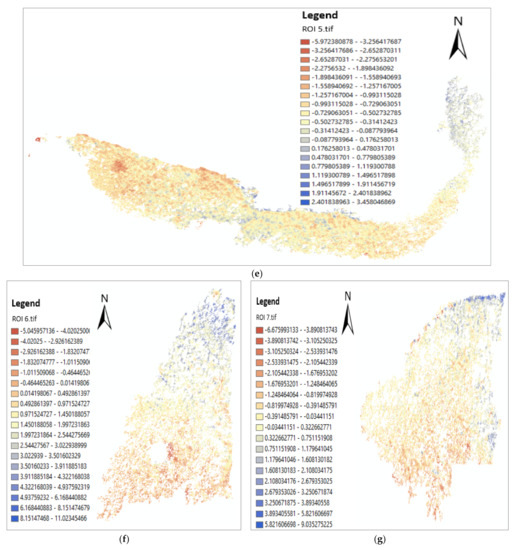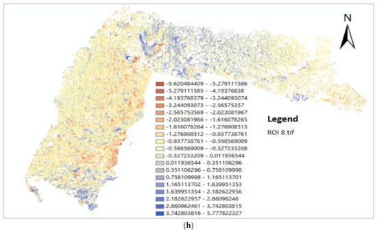 The result of change detection at different ROIs at Kilim River using GCD software: (a) ROI 1; (b) ROI 2; (c) ROI 3; (d) ROI 4; (e) ROI 5; (f) ROI 6; (g) ROI 7; (h) ROI 8.