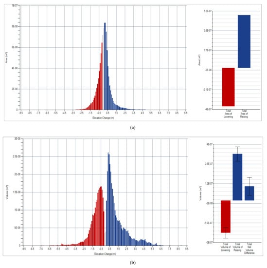 The histogram and change bars in Figure 9 showed ROI 1 (a) experienced almost a balanced proportion of erosion and accretion for areal changes, with accretion slightly higher than erosion, while ROI 1 (b,c) also displayed more accretion than erosion in their histograms for volumetric changes and vertical changes. The histogram and change bars of ROI 2 (a,b) in Figure A1 show an imbalanced proportion of erosion to accretion for areal and volumetric changes, and a similar thing appeared on the change bars of ROI 2 (c). For ROI 3 (a,b) rates, erosion appeared more dominant than accretion, and vertical changes also increased to a significant value, as displayed in Figure A2. A similar situation occurred at ROI 4 and 7 in Figure A3 and Figure A5, while ROI 8 in Figure 6 demonstrated that erosion was more dominant than accretion, but this was not the case in ROI 6 (Figure A5), where accretion was far greater than erosion. Vertical changes directly affected the imbalance between erosion and accretion, which was proved by the change bars in all ROIs (c) that propagated the values of the average depth of lowering, the average depth of raising, and the average total thickness difference.