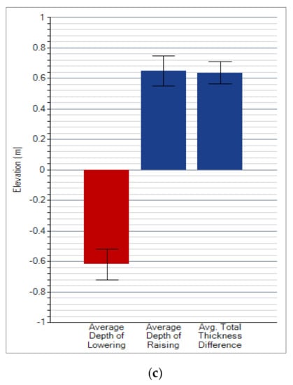 Geomorphic Change Detection (GCD) analysis for ROI 1; (a) areal changes; (b) volumetric changes; (c) vertical averages. The remaining results of the GCD analysis were placed in the Appendix A.
