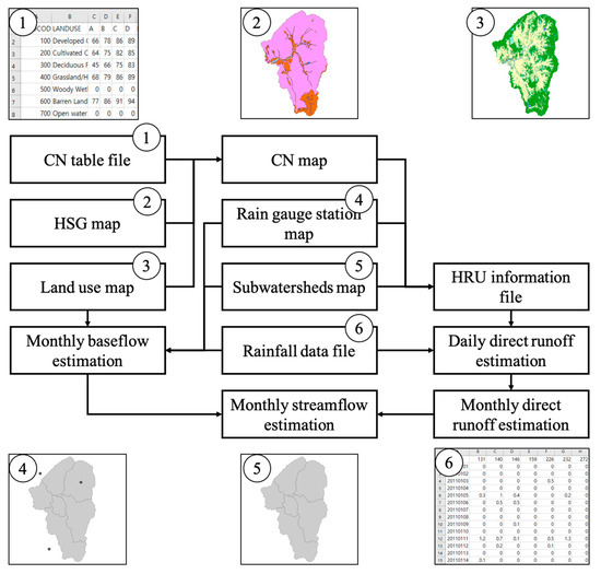 The land use maps, subwatershed maps, rain gauge station maps, and rainfall data files are necessary for calculating baseflow. First, land use and subwatershed maps are used to draw land use data for each subwatershed, and the rain gauge station applied to each subwatershed is defined using the subwatershed and rain gauge station maps. The land use area for each subwatershed and the monthly rainfall are applied to Equation (7) to estimate the monthly baseflow for each subwatershed (Figure 1).