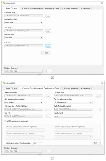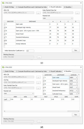 The L-THIA 2022 model was developed to be operable in QGIS 3.10, and it is composed of four interfaces (Figure 2). The first interface generates the CN map necessary for estimating direct runoff and requires land use and HSG maps as input data (Figure 2a). In the second interface, the subwatershed map, gauge station map, and daily rainfall data files are required as input data, which is then used to estimate the daily direct runoff (Figure 2c). The CN file in the CSV format can be adjusted in the Microsoft Excel software and is matched with the CN map created from the first interface to define the spatially distributed CN of the HRU. Furthermore, direct runoff is calculated with this spatially distributed CN of the HRU, for which the CNs require adjusting during model calibration. Microsoft Excel must be used to edit CN files, assisting the cumbersome processing of the CN map; this must be repeated multiple times by comparing data with the measured streamflow (or direct runoff) until a satisfactory estimated streamflow (or direct runoff) is achieved. Therefore, the model in the study was developed to enable the application of the immediately adjusted CN in the model interface (Figure 2c). The fourth interface is used for estimating the baseflow of each subwatershed and for classifying the user’s land use according to the land use classification (i.e., urban agriculture, forest, pasture, wetland, bare land, or water) to estimate the monthly baseflow, as seen in Equation (7). In addition, the coefficients for each land use in Equation (7) can be adjusted in this interface (Figure 2d).