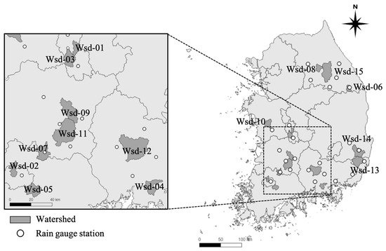 This study proposed an L-THIA 2022 model, which is operable in the QGIS software, for estimating monthly streamflow. In addition, a test application of the L-THIA 2022 model was performed, for which the land use map data (scale at 1:5000) were provided by the Environmental Geographic Information Service [24], the monthly rainfall provided by the Korea Meteorological Administration (KMA) [25], and the daily flow rate provided by the Water Resources Management Information System (WAMIS) [26]. In the watershed for test application, flow measurement points from WAMIS were set as watershed outlets and selected to avoid any spatial overlap. A total of 15 watersheds were selected (Figure 3), and the watershed areas ranged from a minimum of 5841 to a maximum of 81,107 ha (Table 2). The land use of each watershed was classified into urban, agriculture, forest, pasture, wetland, bare land, and water. Forests accounted for the largest area in each watershed excluding Wsd-02, followed by agriculture.