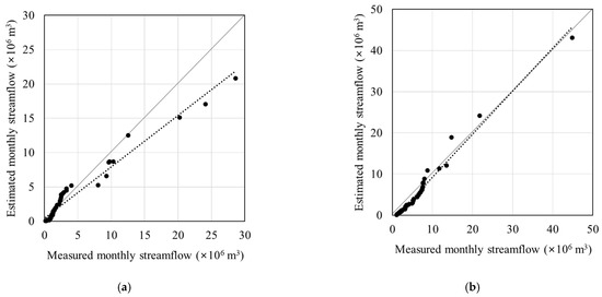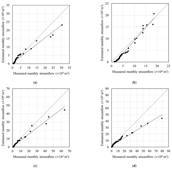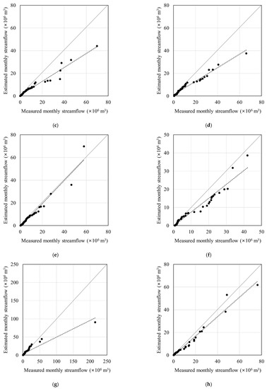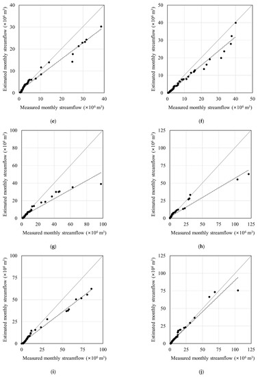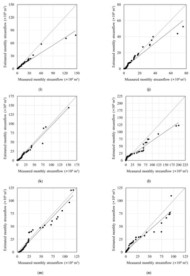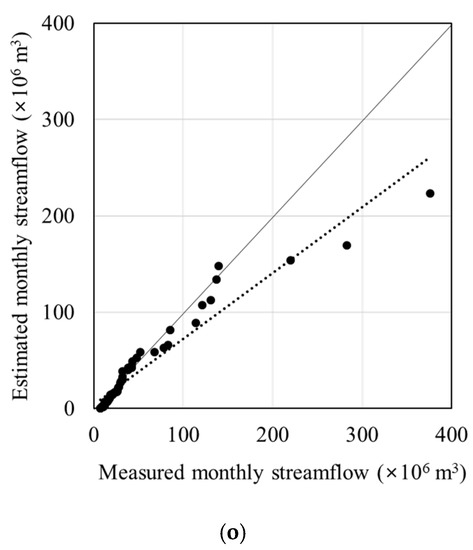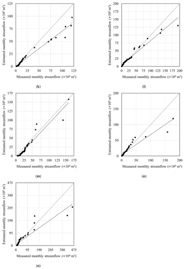 Scatter plots of measured and estimated monthly streamflows during validation: (a) Wsd-01; (b) Wsd-02; (c) Wsd-03; (d) Wsd-04; (e) Wsd-05; (f) Wsd-06; (g) Wsd-07; (h) Wsd-08; (i) Wsd-09; (j) Wsd-10; (k) Wsd-11; (l) Wsd-12; (m) Wsd-13; (n) Wsd-14; and (o) Wsd-15.