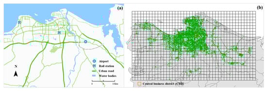 In order to aggregate the order records in space, we adopted a grid cell structure (1 km × 1 km) to divide the whole study region into different spatial units [19,21]. A total of 1032 grid cells were created as a result, as shown in Figure 1b. Each ride-hailing order was assigned to a grid cell based on its geographic coordinates. The lengths of different levels of roads and the number of different types of POIs in each grid cell were also obtained based on the Intersect toolbox in ArcGIS.