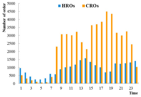 As shown in the figures, on weekdays, the demand of CROs witnessed a sharp rise from 6:00 a.m. to 9:00 a.m., followed by a steady trend in the next few hours until 12:00 p.m. In the afternoon, the demand of CROs experienced a temporary decline before reaching its peak at 6:00 p.m. This is consistent with the relatively large demand of the residents for ride-hailing services during the peak period [19]. By comparison, the demand of HROs rose steadily in the morning before reaching the first demand peak of the day at 2:00 p.m. The main reason for this is that there were fewer congested roads in the city, and the operational efficiency of ride-hailing vehicles was higher at this time. After the demand of HROs dropped to the lowest at 6:00 p.m., it then reached the second demand peak of the day at 12:00 a.m. At this time, some public transportation services were no longer running, and traffic conditions were generally good. It can be seen that under the influences of the road conditions, residents’ travel habits and public transportation, the demand of HROs changed significantly in the course of a day. In addition, the demand of these two types of orders had some similarities between weekdays and weekends, but the level of demand of CROs was lower in the mornings of weekends. The main reason for this is that people tend to rest at home before undertaking entertainment and other activities on weekends, and the departure time is relatively later than that on weekdays [29].