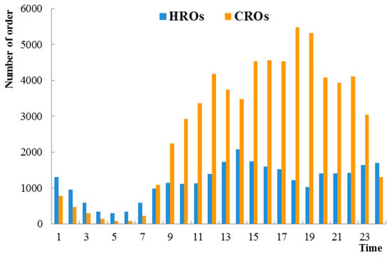 In order to explore the travel characteristics of HROs and CROs at different times of the day, the order data from 2 September to 29 September were utilized to calculate the hourly demands of HROs and CROs. As shown in Figure 2 and Figure 3, they represent the hourly average travel demand of HROs or CROs on weekdays and weekends, respectively.