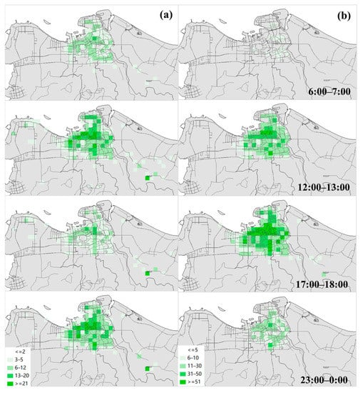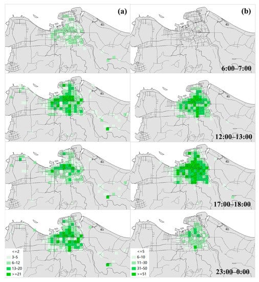 In this study, the density of HROs refers to the number of hourly HROs divided by the area of the grid cell, which is 1 km2. As for each grid cell in Figure 1b, we could obtain the density of HROs for any one hour in a day. The definition of the density of CROs is similar. To explore the spatial distribution differences of HROs and CROs during different periods, four periods—night (from 12:00 a.m. to 6:00 a.m.), morning (from 6:00 a.m. to 12:00 p.m.), afternoon (from 12:00 p.m. to 5:00 p.m.) and evening (from 5:00 p.m. to 12:00 a.m.)—were selected according to their demand distributions (see Section 5.1) to analyze the spatial variation of two types of orders.