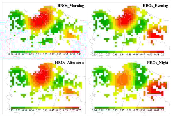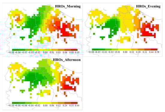 With regard to the performance indicators of the models, we showed the values of AIC, AICc, R2 and adjusted R2. As seen in Table 3, for the four periods, the GWR models all outperformed the OLS models in terms of model fit. Taking the HROs_ Morning model as an example, the AIC and AICc values of the GWR model (1282.759 and 1288.717) were lower than those of the OLS model (1321.149 and 1322.082), and the R2 and adjusted R2 values of the GWR model (0.877 and 0.863) were greater than those of the OLS model (0.851 and 0.847). The improvement in data fitting indicates the superiority of the final models.