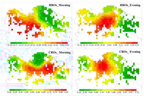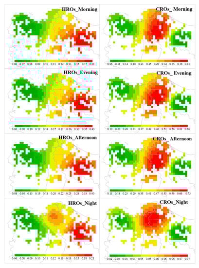 To observe the differences of the effects of various variables on the densities of HROs and CROs during the four periods more conveniently, Table 4 summarizes the results of the OLS models (i.e., HROs_Morning, CROs_Morning, HROs_Evening, CROs_Evening, HROs_Afternoon, CROs_Afternoon, HROs_Night and CROs_Night).
