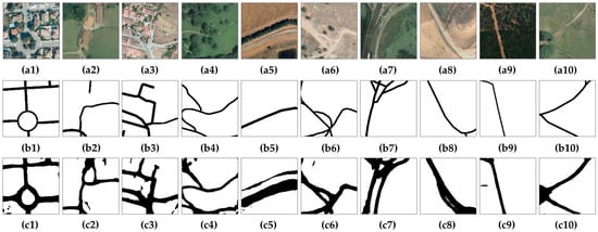 The relation between the aerial orthoimage (first row, (a1–a10)), the rasterised segmentation mask (ground-truth or real sample, seen in the second row, (b1–b10) used as conditional information for training ), and the semantic segmentation predictions (seen in the third row, (c1–c10), used for testing the performance of the model). Note: The training set contains tiles with road representation present in official cartography, while the test set contains tiles with initial segmentation predictions resulted from evaluating the aerial images with the segmentation model. In this figure, white is used to represent pixels labelled with “No road”, or “Background”, and black is used to represent the pixels belonging to “Road” class.