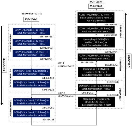 In terms of the architecture, the generator is a U-Net-like network and features a series of convolutional layers with a kernel size of 3 × 3 and zero padding added (to avoid tile shrinking during processing) that progressively downsample the input tile. Following the recommendations from [], in the downsampling blocks of the encoder, the convolutional layers are followed by Batch Normalisation [] to ensure faster training and Rectified Linear Unit (ReLU) [] activations.