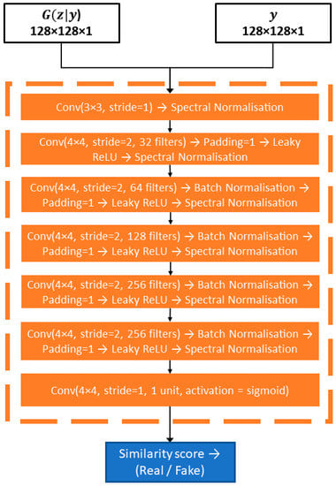 A simplified representation of the discriminator network implemented can be found in Figure 4. The total number of parameters of is 2,791,009, an 85.61% decrease when compared to the original PatchGAN (which features 6,968,257 parameters). Please note that we built our generator and discriminator networks using concepts introduced by U-Net and PatchGAN (e.g., encoder–decoder structures with skip connections, or modelling an image as a Markov random field over a determined patch size), but we focused on reducing the computational footprint of the networks to take advantage of the computational budget available.