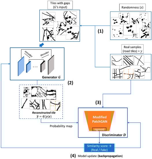 The generator, , takes a corrupted tile of 256 × 256 pixels as input and provides an inpainted version, where the gaps are filled. Next, evaluates the four patches of the generated image and the four patches of the original sample from (containing a road representation from the official road cartography, without gaps) to calculate the cross entropy between the corresponding pairs of patches of 128 × 128. The error is then backpropagated through the model. A simplified representation describing the learning procedure of the cGAN model implemented can be found in Figure 5.