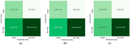 In order to study the relationship between the error rates obtained by the neural networks trained in this work and the significance of the performance metrics, in Figure 6 we illustrate the confusion matrices obtained by the models when evaluating the test set containing unseen data ( tiles). In the confusion matrix obtained by our implementation (presented in Figure 6c), it can be found that our model correctly recognised 3,795,275/4,360,728 pixels belonging to the “Road” class (TP ratio of 0.87) and 101,552,358/106,788,328 “No Road” instances (TN ratio of 0.951), while incorrectly labelling 5,235,970/106,788,328 pixels of the “No Road” category (FP ratio of 0.049) and missing 565,453/4,360,728 instances of the “Road” class (FN ratio of 0.130). In the confusion matrix, FN and FP are the samples that were incorrectly classified and represent 5.22% of the predictions, while TN and TP are the samples that were correctly classified and represent 94.78% of the predictions. By comparison, the segmentation model that provided the initial predictions correctly classified 93.79% of the pixels, while the best version of the Thin-structure [] model, trained for deep inpainting, correctly classified 94.36% of the pixels. The results from the confusion matrices are aligned with the results presented in Table 1.