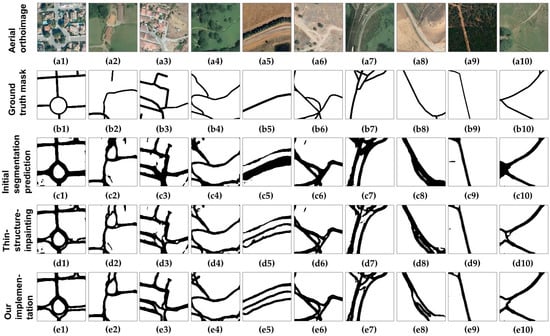 Qualitative interpretation carried out on ten samples from the test set. In the first row (a1–a10), we have the aerial orthoimage. The second row (b1–b10) presents the samples from the rasterised ground truth set, or conditional data distribution (road representations present in official cartography). The third row (c1–c10) shows the initial segmentation prediction obtained using a state-of-the-art semantic segmentation model. The fourth row (d1–d10) presents the predictions generated with the Thin-Structure-Inpainting model [] trained for deep inpainting operations, while the fifth row (e1–e10) presents the reconstructed road masks generated with the conditional generative model proposed in this paper.