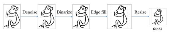- Size normalization: to keep the size of all images consistent without destroying the useful information areas of them, we rescaled the size of the image to . For the original non-square images, we filled the blank edge area with white pixels first and then scaled them to the required size.