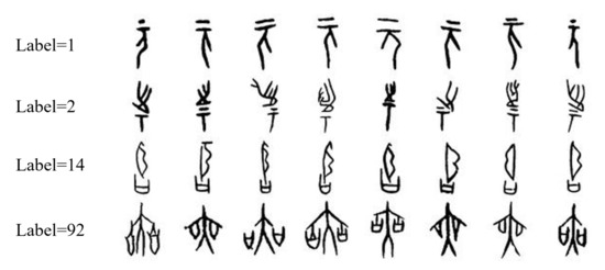 - We created a dataset named OBI-100 with 100 classes characters of OBI, covering various types of characters, such as animals, plants, humanity, society, etc., with a total of 4748 samples. Each sample in the dataset was selected carefully from two definitive dictionaries [16,17]. In view of the diversity of ancient OBI writing styles, we also used rotation, resizing, dilation, erosion, and other transformations to augment the dataset to over 128,000 images. The original dataset can be found at https://github.com/ShammyFu/OBI-100.git (accessed on 10 December 2021).