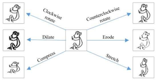 The insufficient number of samples in the dataset leads to low recognition accuracy, so we expand the dataset to improve the effectiveness of the recognition task. Considering the randomness of the same character when it is written multiple times, the angle or thickness of the character writing may change. Therefore, we perform several transformations to produce new images, as shown in Figure 5 for each sample.