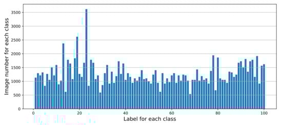 After the augmentation operation, each original image produces 26 corresponding transformed images. The total number of samples increased by 27 times to 128,196 (). The smallest class contains about 540 images and the largest category has over 3600 images. It presents the number distribution of each category in the OBI dataset in Figure 6.