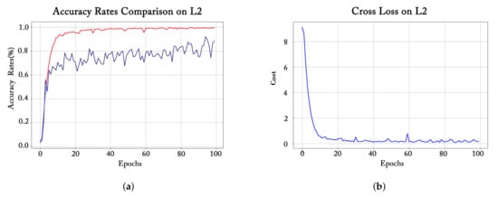 Training accuracy, validation accuracy, and training loss during L2 model training. (a) Accuracy comparison. (b) Cross loss.