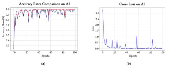 For the A3 model (one of the improved AlexNet models) in Figure 9, the accuracy rates on the training set and the validation set basically maintain a consistent trend on the whole. Specifically, in the first ten epochs of training, both curves rise rapidly. After 10 epochs, the training accuracy gradually tends to 100% and becomes smooth, while the validation accuracy curve still has large fluctuations. This suggests that the learning of the A3 model is not stable enough despite the high recognition accuracy within 100 epochs.