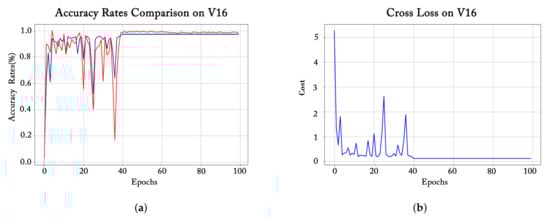 The training process of the V16 model (one of the improved VGGNet models) is shown in Figure 10. From these two graphs, we can clearly observe that on the V16 model, both the training and validation accuracy rates increase with very sharp fluctuations in the first 40 epochs, and these fluctuations also occur on the training loss curve. However, after the 40th epoch, the training and validation accuracy curves are smoothed around 100%, and the training accuracy is slightly higher than the validation accuracy. From this we conclude that the V16 model only needs about 40 epochs to converge and has good recognition performance.