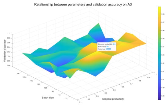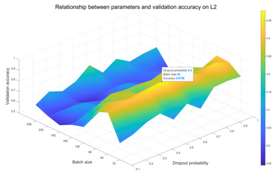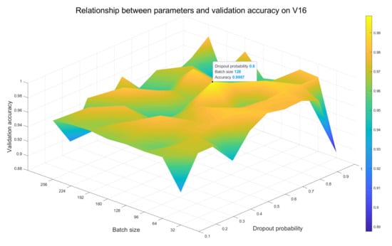 According to the color change of the surface plots, it can be inferred that the more drastic the color system changes, the greater the impact of different choices of values of the batch size and the dropout probability on the models is. From Figure 11 we see that there are obvious blue and yellow areas, indicating that the accuracy of the L2 model is most affected by these two parameters, followed by the A3 model in Figure 12. The color system of the surface map in Figure 13 corresponding to the V16 model changes smoothly, so it is minimally affected by the two parameters. In addition, the highest point indicates the optimal combination of batch size and dropout probability values. For the L2 and A3 models, setting the batch size and dropout probability values to 64 and 0.5 is the optimal choice, while for the V16 model, they should be set to 128 and 0.6, respectively.