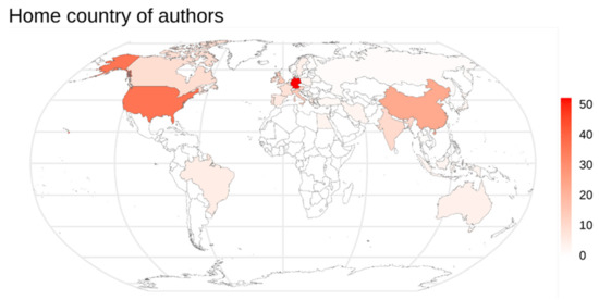 In terms of geographic locations, 142 papers were authored by researchers located in the same country; the remaining 58 papers (28.9% of the total) were written by authors with affiliations in more than one country: 2 countries (44, 22.0%), 3 countries (9, 4.5%), 4 countries (4, 2.0%) and 5 countries (1, 0.5%). Authors were predominantly affiliated to institutions in Europe, followed by Asia, with little representation to other continents (see Table 3). When looking at authors’ affiliation countries, Germany leads with 52 papers (i.e., 26% of the total) with at least one author’s affiliation from it, followed by United States of America (36), China (23), Italy and United Kingdom (14 each), Austria (12), India and Ireland (10 each); all other countries scored less than 10 papers. A visual representation of this distribution is provided in Figure 1. Although the analysis has not specifically looked at the authors’ names (but just at their affiliations), the country distribution found is overall in line with the list of authors publishing the highest number of OSM-related papers in the years 2007–2016 found in [26].