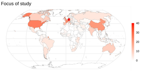 Similar to the result for authors’ affiliations, the majority of papers (117, i.e., 58.5% of the total) consider study areas in only 1 country, 17 papers (8.5%) in 2 countries, 6 papers (3.0%) in 3 countries, 5 papers (2.5%) in 4 countries, 5 papers (2.5%) in 5 and in 6 countries, and 9 papers (4.5%) in more than 6 countries. The highest number of countries considered in a single paper is 34. Five papers used entire continents as their study areas—4 used Europe as their case study (2.0%) and 1 used Asia (0.50%). As evident in Table 3, papers which do not include case studies are more common than papers which use data from the whole world (i.e., ‘Global’), but the volumes of both phenomena are not very large. Within Europe, which is the most commonly studied continent (see Table 3), the focus is mostly on western European countries such as Germany, France, United Kingdom, Italy, Spain, and Austria (see Figure 2). The only other countries chosen in more than 10 papers are the United States of America (24 papers) and China (18), highlighting again that interest is clustered to specific countries within the most studied continents.