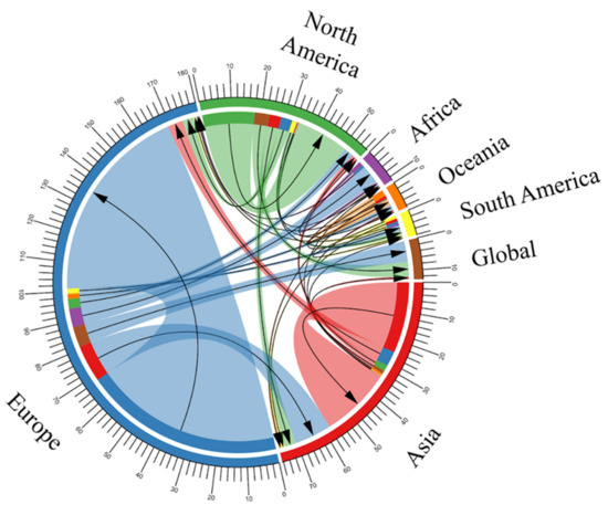 Graphical representation of the number of OSM-related papers based on the continents of authors’ affiliations and the continents of study areas. Arrows indicate a flow from the affiliation continent to the case study continent. The radial axis indicates the number of papers.