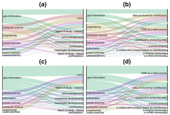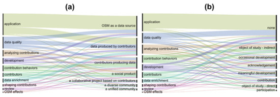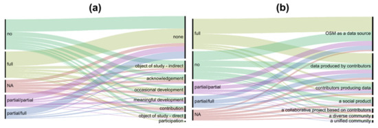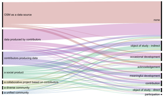 So far, we have analyzed each category independently of other variables (with the exception of geographic correspondence between affiliation and study area). Yet, as discussed in Section 1, it is possible that engagement with OSM-C (or lack thereof) will bias research towards certain directions. To explore this, this section analyzes the relations between the values of several pairs of variables to extract meaningful linkages between the measured values. This is undertaken in a qualitative way through the use of alluvial diagrams [47], which link values of one variable with values of another using lines, with the thickness of the line representing the number of observations (papers) classified using the specific pair of values. (All figures in this section were created using the online interface of RAWGraphs [48]). Notice that since it was possible to classify a paper using multiple values for some of the variables, some papers are ‘double-counted’ in these figures and hence the proportion of certain values change between figures. The CSV files upon which these figures are based are available at [44].