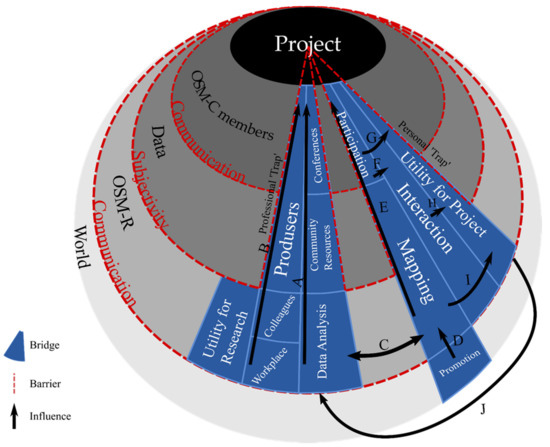 Bridges are connecting elements, yet, as in real-life, they may facilitate the creation of bottlenecks. These bottlenecks are evident in the perspective traps mentioned in Section 3.2—the nature of bridges critically depends on the point of contact forming them and hence may lead to interaction and exchange with only specific segments of OSM-C (colleagues, members of a certain sub-community, attendees of SotM), therefore providing a relatively narrow understanding of its complexity. Hence, each sphere, while including multiple bridges, is also potentially surrounded by a barrier in Figure 8 (the same way a road bridge may be surrounded by water). However, the intra-sphere movement mentioned above facilitates movement between traps and introduces more diversity into one’s experience, thus somewhat limiting the influence of traps.