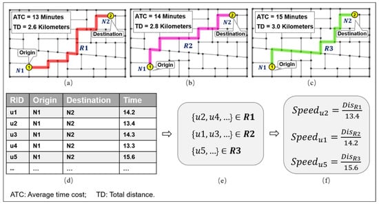As shown in Figure 2a–c, N1 to N2 has three recommended paths, namely R1, R2, and R3. Obviously, although the origin and destination points of the three paths are the same, the three paths have different lengths and times taken. The lengths of R1, R2, and R3 are 2.6, 2.8, and 3.0 km, respectively, and take 13, 14, and 15 min to travel, respectively. Figure 2d shows the lending and returning data of public bicycles obtained from the Suzhou Public Bike System, from which the number of trips between N1 and N2 are many (u1, u2, u3, u4, u5, etc.). The timestamp duration of each public bicycle trip can be calculated by subtracting the returning time and lending time in the operational database. The actual time taken by u1–u5 was 15.2, 13.5, 16.4, 13.3, and 18.6 min, respectively. A comparison of the actual time taken and the recommended time taken for each record revealed that the closer the two values are, the more the path matches. Here, the path from N1 to N2 and its length were determined, and the average travel speed of each public bicycle trip was calculated.