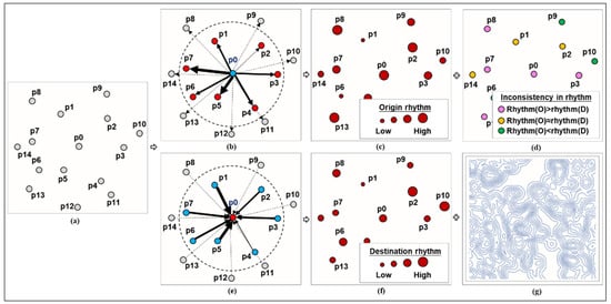 Rhythm analysis flow chart based on the docking stations of public bicycles. (a) spatial distribution of all public bicycle docking stations; (b) source stations; (c) origin rhythms; (d) inconsistency in rhythm; (e) sink stations; (f) destination rhythms; (g) rhythm contour.