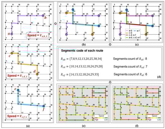The total number of public bicycle trips passed on each segment can be marked by different colors (Figure 4c). is the path segment bounded by the road nodes 12 and 13. Similarly, is the path segment bounded by the road nodes 13 and 12 (the numbers in subscript represent road nodes, and the sequence of numbers represents the path segment direction). For example, passed by paths cd and ef, whereas only passed by path ab, and only passed by path ef. The corresponding formulas are as follows: