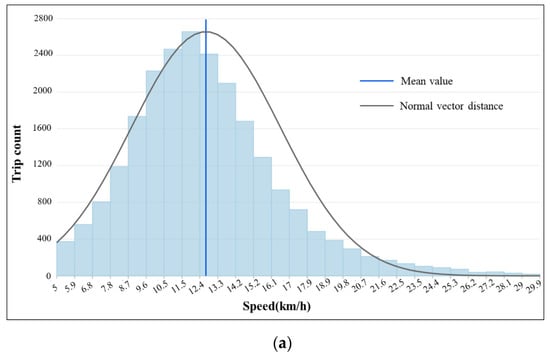 The results come from membership data for cyclists rather than management data for bicycle relocation. The speed of the overall volatility of the observed cycling rhythms and the trip count in speed stratification were characterized at 30-s intervals within a day as shown in Figure 5. Among the 27 rhythm gradients in Figure 5a, the maximum value is 29.9 km/h and the minimum value is 5 km/h. The average speed is 12.7 km/h and the median value is 12.2 km/h. The skewness value of the curve is 0.9, which indicates that the probability distribution of the normal vector distance is skewed to the right. The kurtosis value of the curve is 4.4, which means the cycling rhythm distribution is higher than the normal distribution. The majority of the cycling trips tend to be between 9 and 16 km/h with an 85% point line of 14.3 km/h and a 15% point line of 9.6 km/h. The maximum speed of public bicycles is around 25 km/h. We also found that those over 25 km/h account for 1.3%, which might be caused by sliding down the slopes in cycling activities.
