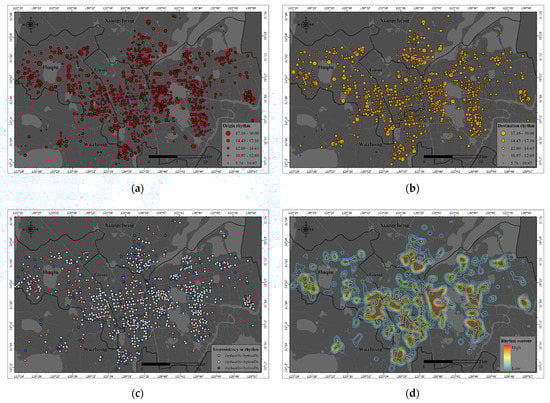 However, the spatial distributions of source and sink rhythms are quite different. The details of cycling rhythms at each station can be queried from the maps if needed. From the perspective of location characteristics, origin stations may have a high rhythm in residential areas surrounded by workspace and schools, and vice versa. As shown in the southeast and southwest sides of the city area in Figure 6a,b, the source and sink rhythms of such places are complementary to each other. It is found that by comparing each station’s source and sink rhythms in Figure 6c that source and sink rhythms were approximately equal at 62.1% of stations, 22.9% of the stations’ source rhythms were faster than sink rhythms, and 16% of the stations’ source rhythms were slower than sink rhythms. Specifically, around 38.9% of public bicycle docking stations show substantial inconsistency in cycling rhythm based on the source–sink relationship comparison. For example, the cycling rhythm from the resident community to schools may be faster than that from schools back to the resident community.