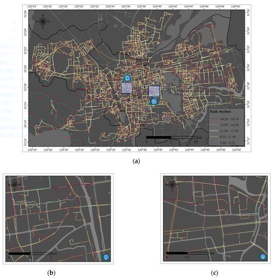 As the intermediate carrier of public bicycle riding, roads also reflect the cycling rhythm. The average rhythmic distribution map of all paths in the study area obtained through online map-based riding path recognition and the cycling rhythm calculation of segments is shown in Figure 7a. According to the natural discontinuity method, cycling rhythms with a focus on paths are divided into five types. The details of the cycling rhythms of each segment can be queried from the maps.