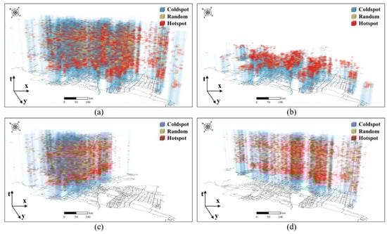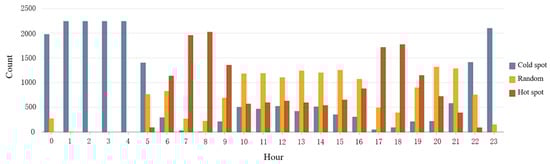The cycling rhythm heterogeneity of different regions at different times of the day is revealed by urban chronotopes from the perspective of spatiotemporal analysis. A non-dissected space–time cube is a chaosphere, and the details inside are not easy to see. Therefore, the analysis results obtained by the space–time hot spot detection model with public bicycle stations as the basic space object by different cross-sections are shown in Figure 8. The X–Y axis represents the urban space, and the vertical axis T represents the time of day with 30 min as the basic time unit. Figure 8a shows the spatial and temporal rhythm variation characteristic map of Suzhou at 24 h a day, and Figure 8b–d is the north-south and east-west longitudinal sections. Figure 9 shows the statistical analysis results of the number of hot spot feature cubes, cold spot feature cubes, and random feature cubes at different times.