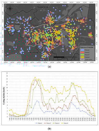 In this study, temporal multilayer characteristics of the cycling rhythm refer to the temporal rhythm patterns and ultrafine difference by special turning points. For the coarser-grained rhythm of variation, the spatiotemporal clustering method is able to provide a list of rhythmic patterns for a finer category. Four cycling rhythmic patterns with similar spatial and temporal rules were identified. As shown in Figure 10a, the distribution of these rhythmic patterns has remarkable overall spatial regularity. The cycling rhythm for Pattern 1 is located in the peripheral area of the city, especially in the west and north. In contrast, the cycling rhythm for Pattern 3 is concentrated on the west side of the city center, which belongs to the old city. The cycling rhythm for Pattern 4 is located in the east of the central city and shows a more remarkable agglomeration in distribution. Moreover, the cycling rhythm for Pattern 2 is widely distributed in the rural–urban continuum of the city and has small-range aggregation features.