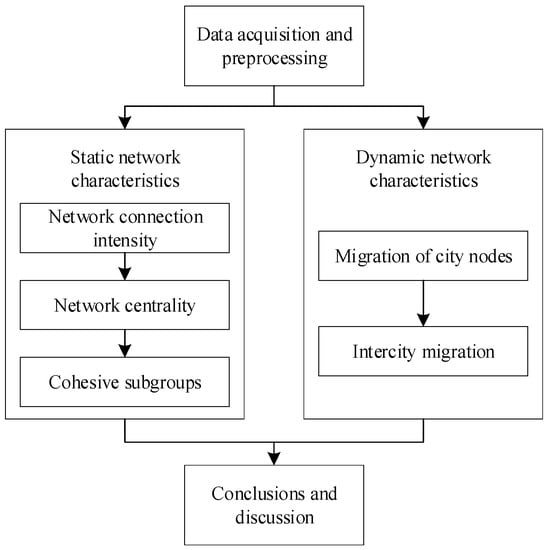 The work flow in this paper is shown in Figure 1. Firstly, the migration data are acquired and preprocessed by calling the network service with a Python program. Then the static and dynamic characteristics of the network are analyzed based on social network analysis, dynamic network mining and visualization, respectively. Finally, the results are summarized and discussed. Among them, social network analysis mainly includes point weight, centrality and cohesive subgroup analysis, while dynamic network mining includes time series clustering of city nodes and dynamic visualization of migration relations.
