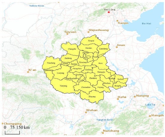 Zhongyuan Urban Agglomeration is located in the intersection area of the land bridge channel and Beijing-Guangzhou channel in the national urbanization strategy of “two horizontal and three vertical” corridors, which represents the middle zone intended to promote China’s economic development from east to west. As one of the seven major urban agglomerations in China, Zhongyuan Urban Agglomeration is dominated by 18 provincial cities in Henan Province and includes 30 provincial cities in Henan, Anhui, Shandong, Hebei and Shanxi Provinces [29]. By 2019, the region covered an area of 287,000 km2, with a total gross domestic product (GDP) of 7965.14 billion yuan and a total population of more than 160 million. As a new urban agglomeration, there are still some problems in the region, such as the large gaps in the development levels of the cities, the uneven integration and distribution of resource elements and the need to strengthen regional connections. Therefore, mining and understanding the comprehensive network pattern of Zhongyuan Urban Agglomeration is of strategic significance for promoting the development of cities in Central China, accelerating the rise of the central region, promoting the construction of new urbanization and expanding new space for economic development in China [30,31]. Figure 2 shows the location of Zhongyuan Urban Agglomeration in China.