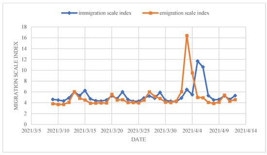Baidu migration data are derived from Baidu Map and third-party user location statistics, which accurately record the migration trajectory of hundreds of millions of people. We obtained the urban migration data of 6 weeks from 9 March to 19 April in 2021 through the Baidu migration platform interface (http://qianxi.baidu.com/ accessed on 21 May 2021). A Python program is used to call the Baidu migration service and acquire migration data for each city, which are saved locally in Excel format. The data attributes include the daily immigration and emigration scale index of each city in Zhongyuan Urban Agglomeration, and the corresponding proportion data of the immigration source and emigration destination. Through data comparison (taking Zhengzhou as an example), it can be found that, except for the Qingming Festival, the migration in the rest periods varies as a weekly cycle, as shown in Figure 3. Therefore, we chose migration data for one week (22 March to 28 March), which can reflect the general migration patterns between cities in non-holiday periods. Although the migration scale index does not refer to the number of migrants, it can be compared horizontally (between cities) and vertically (over time) [32]. To facilitate the accurate expression of this variable, it is uniformly enlarged 100-fold and called the migration scale in this paper.
